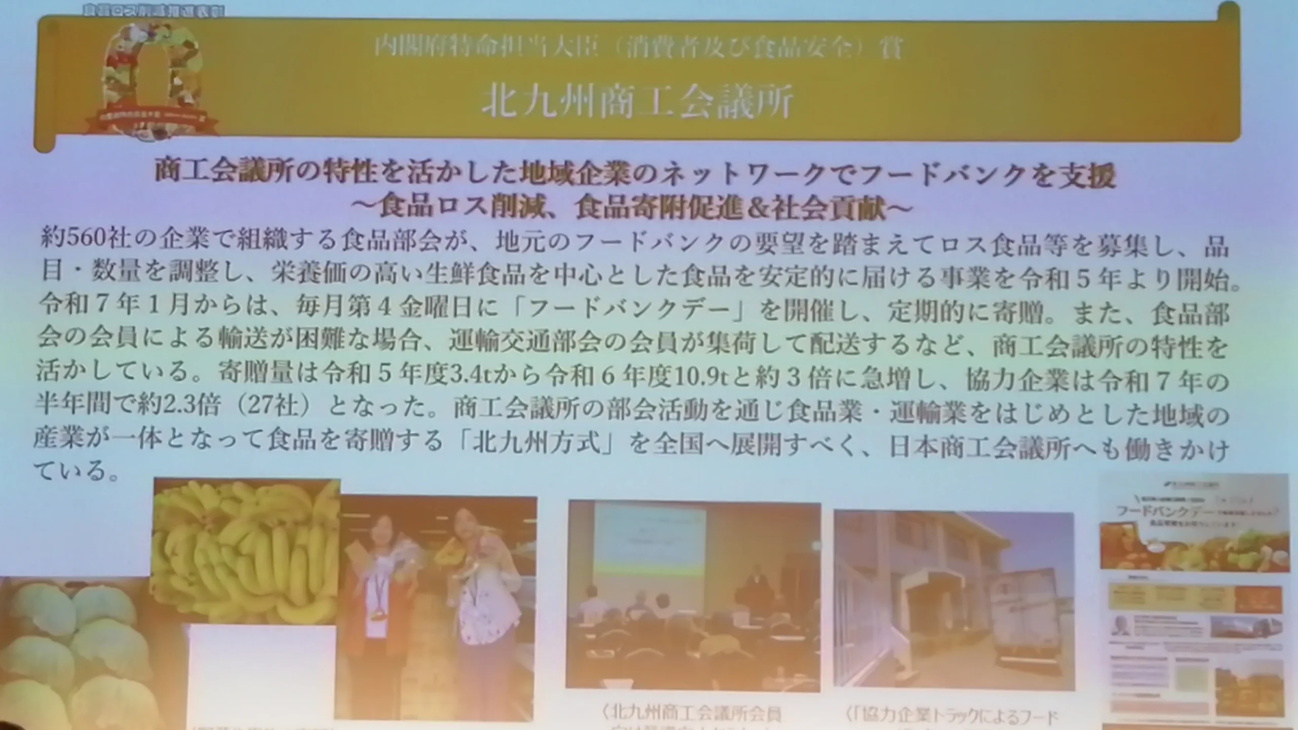 食品ロス削減推進表彰(内閣府特命担当大臣賞)には、北九州商工会議所(福岡県)が選ばれました。地域企業が一体となってフードバンクを支援する取り組みは、“商工会議所ならでは”のネットワーク型寄付モデル「北九州方式」として高く評価されています。